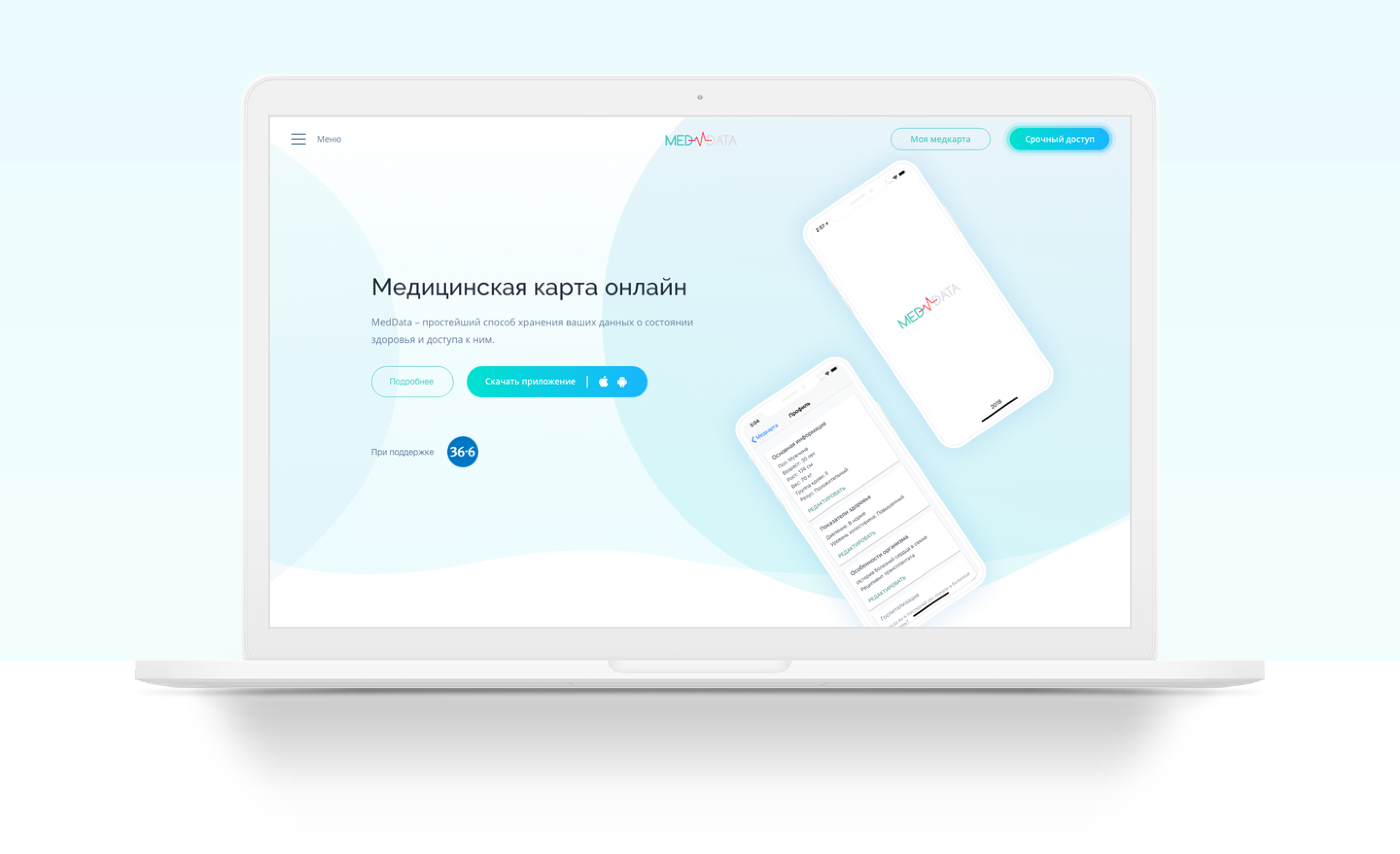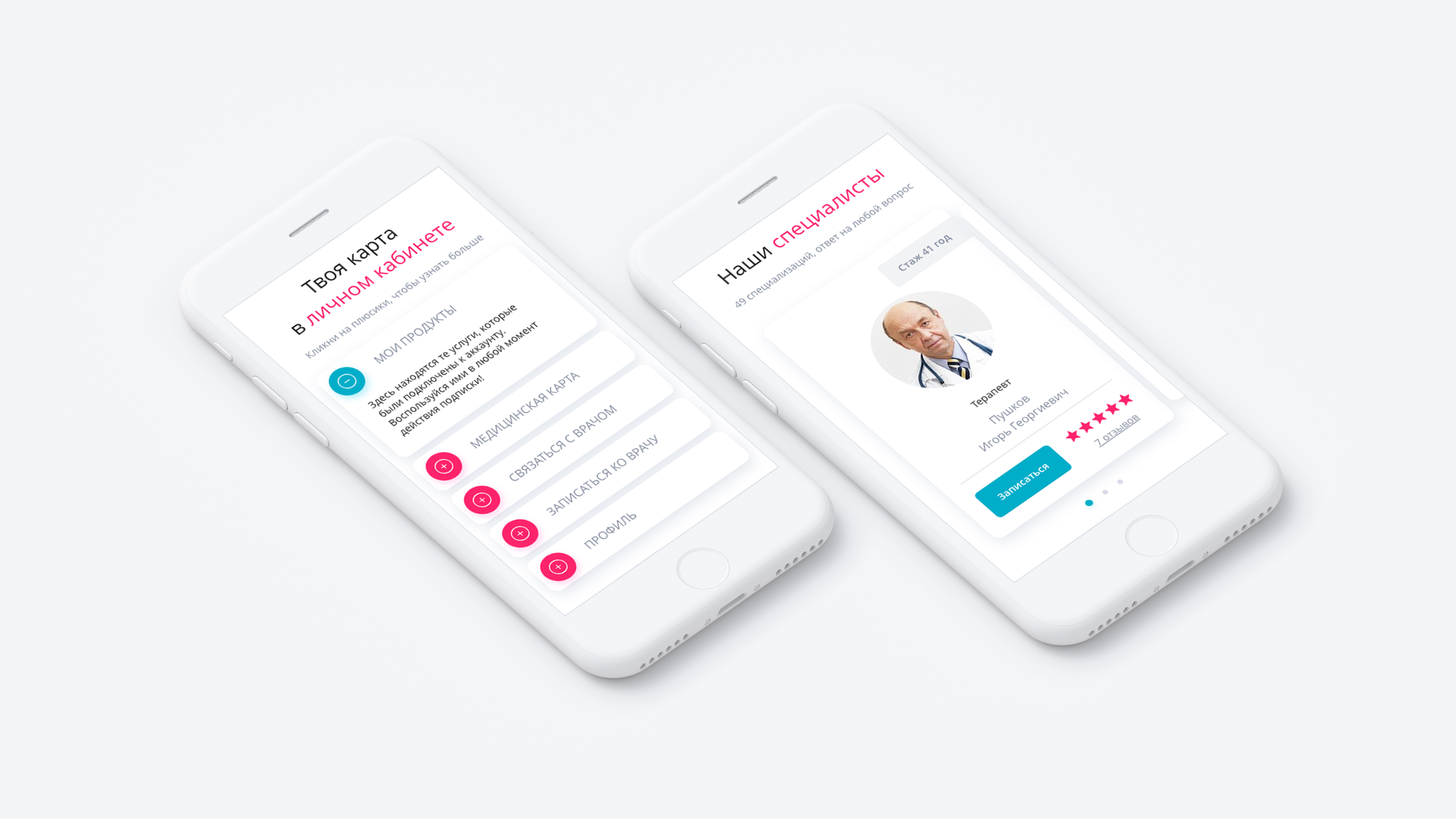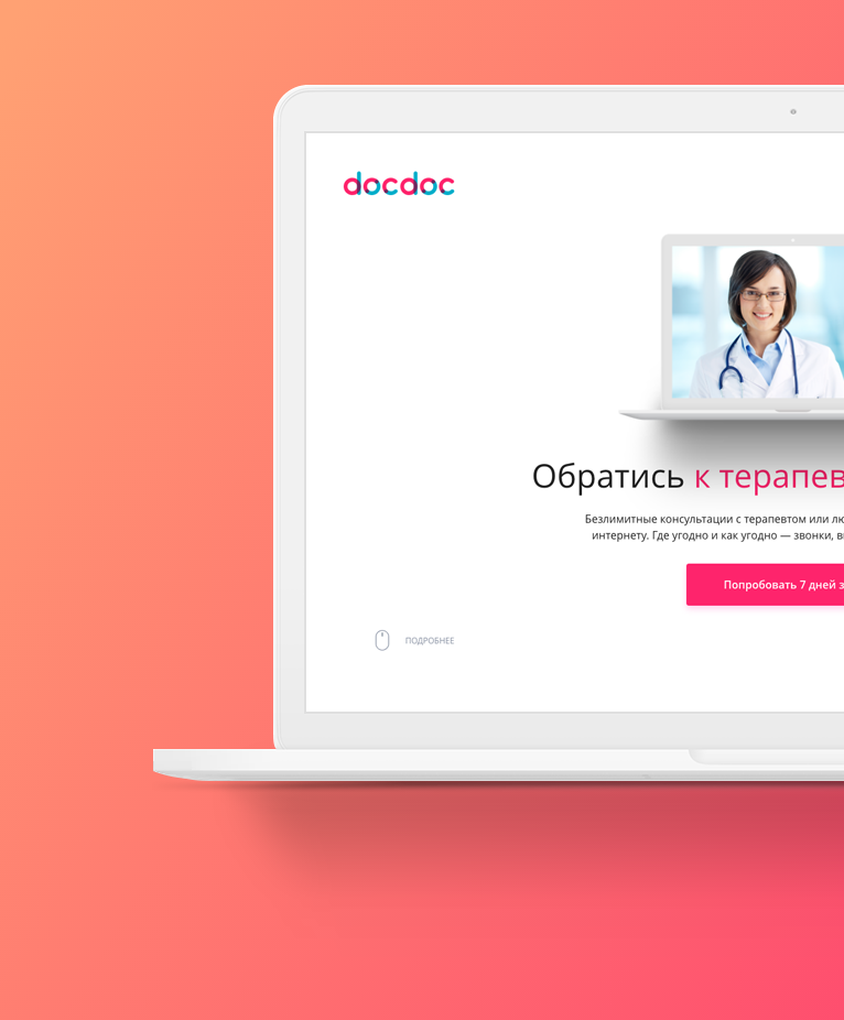 Дизайн, основанный на фирменном стиле компании DOCDOC. Кратко рассказали и показали суть проекта.